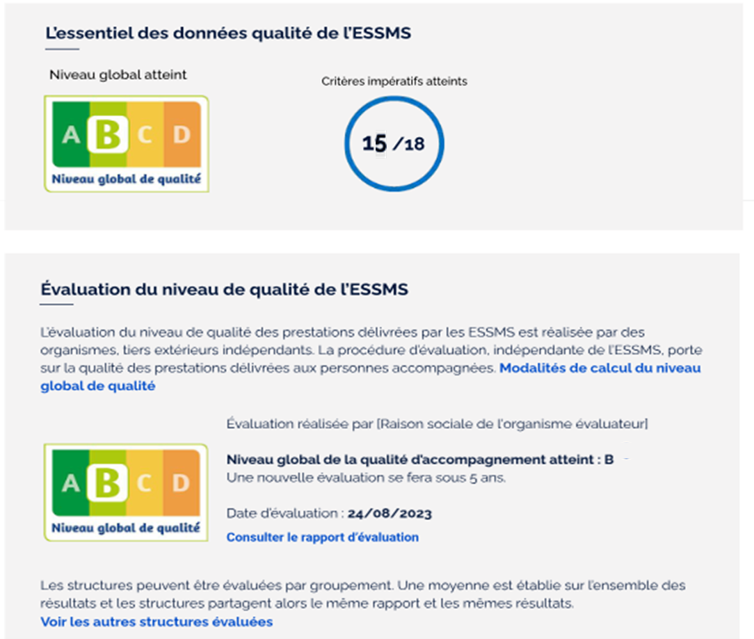 Les résultats seront publiés sur le site de la HAS et devront être affichés dans les locaux des ESSMS dans un délai de quatre mois après la transmission du rapport. Une fiche d’identité de l’établissement, une échelle qualité, et une extraction du rapport d’évaluation seront disponibles sur la page Qualiscope de la HAS. Un  Kit de communication a été mis à disposition.